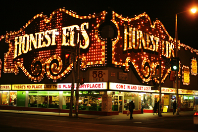 A Toronto institution for over 60 years, Honest Ed’s was famous for its building (actually two buildings joined by a catwalk) covered by a giant light bulb-infused store sign that covers the top two stories, making it at one time an uptown companion to the neon-infused buildings at Yonge and Dundas (Sam the Record Man and A and M Records, anybody?)